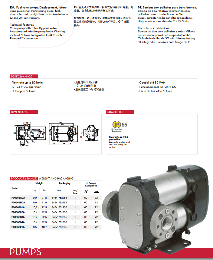 直流滑片式柴油泵, 自吸式旋轉容積葉片泵, 高流量。 備有12V和24V兩種版本可選。