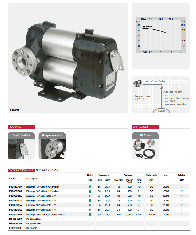 技術特性: 轉子滑片泵。 泵體內置旁通閥。 最長連續工作時間30分鐘, 內置on/off開關。 G1”螺紋接頭。